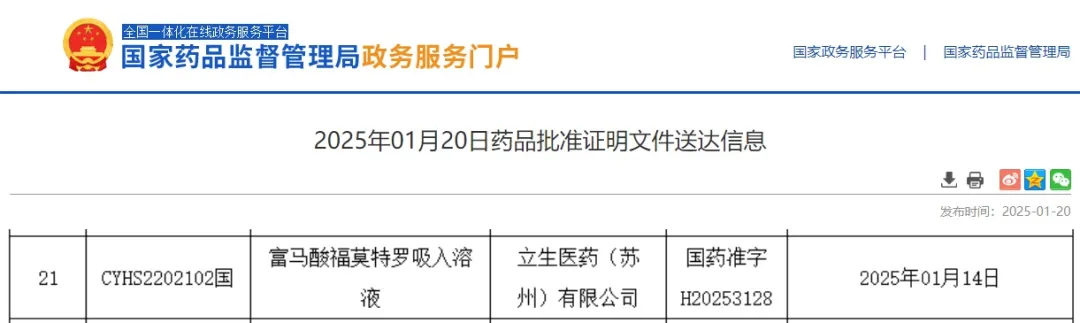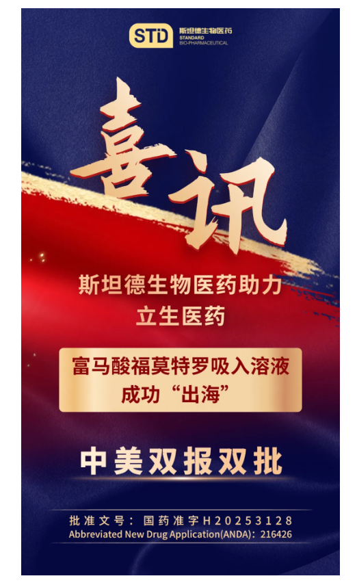 近期,恒星集团科创医药科技(青岛)有限公司成功助力立生医药(苏州)有限公司(以下简称“立生医药”)生产的富马酸福莫特罗吸入溶液成功取得国家药监局(NMPA)批准上市。此前,该药已取得美国食品药品监督管理局(FDA)的批准上市,实现了中美双报双批。
