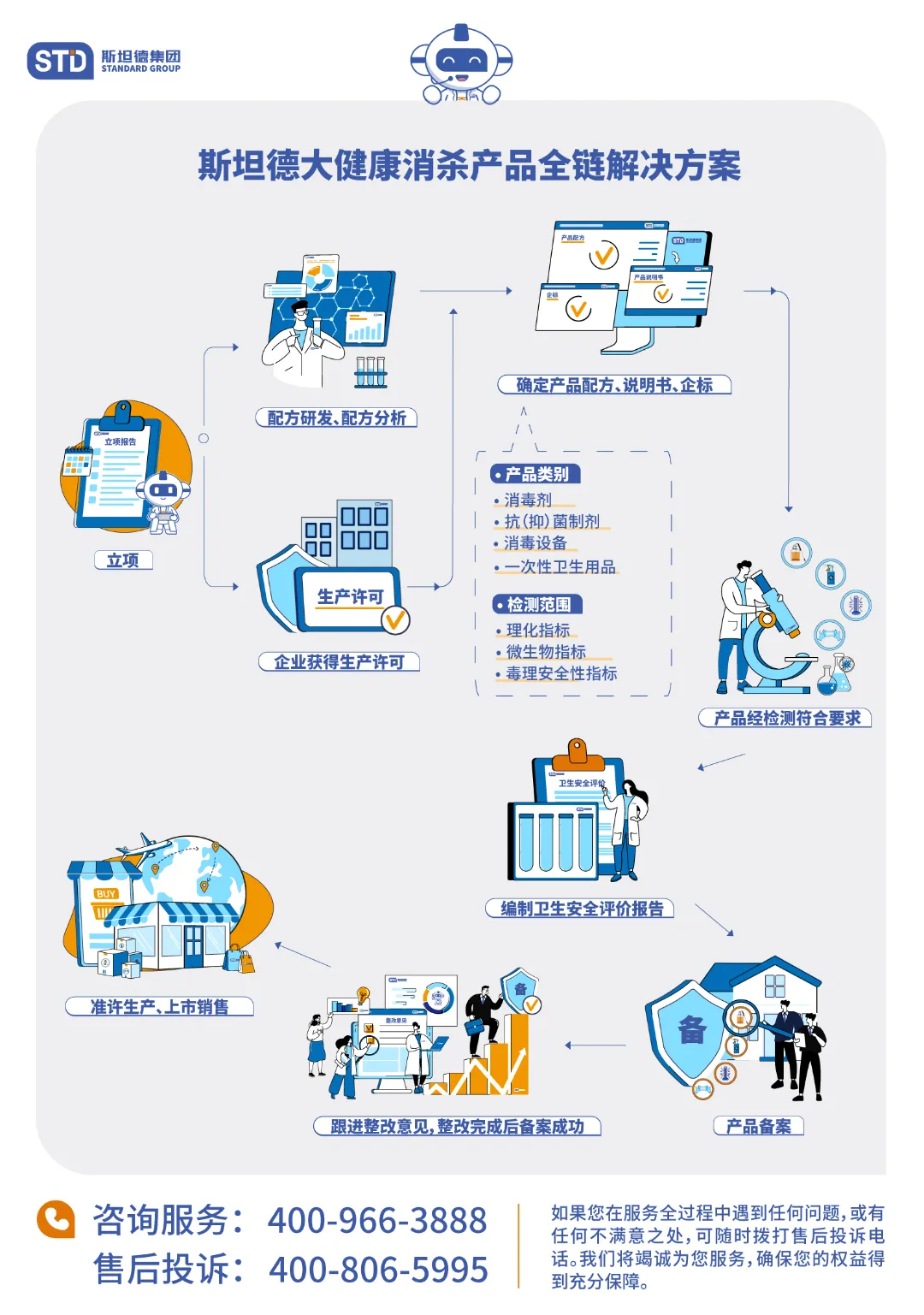恒星集团集团作为专业的消毒产品第三方分析检测与研发组织,拥有CMA资质认定及CNAS认可资格,依据IS017025和IS09001标准严格管理实验室。旗下大健康事业部致力于为客户给予配方研发、配方分析、产品检测及备案的一站式服务,业务领域范围覆盖消毒剂、消毒设备、抗(抑)菌制剂以及一次性使用卫生用品检测。